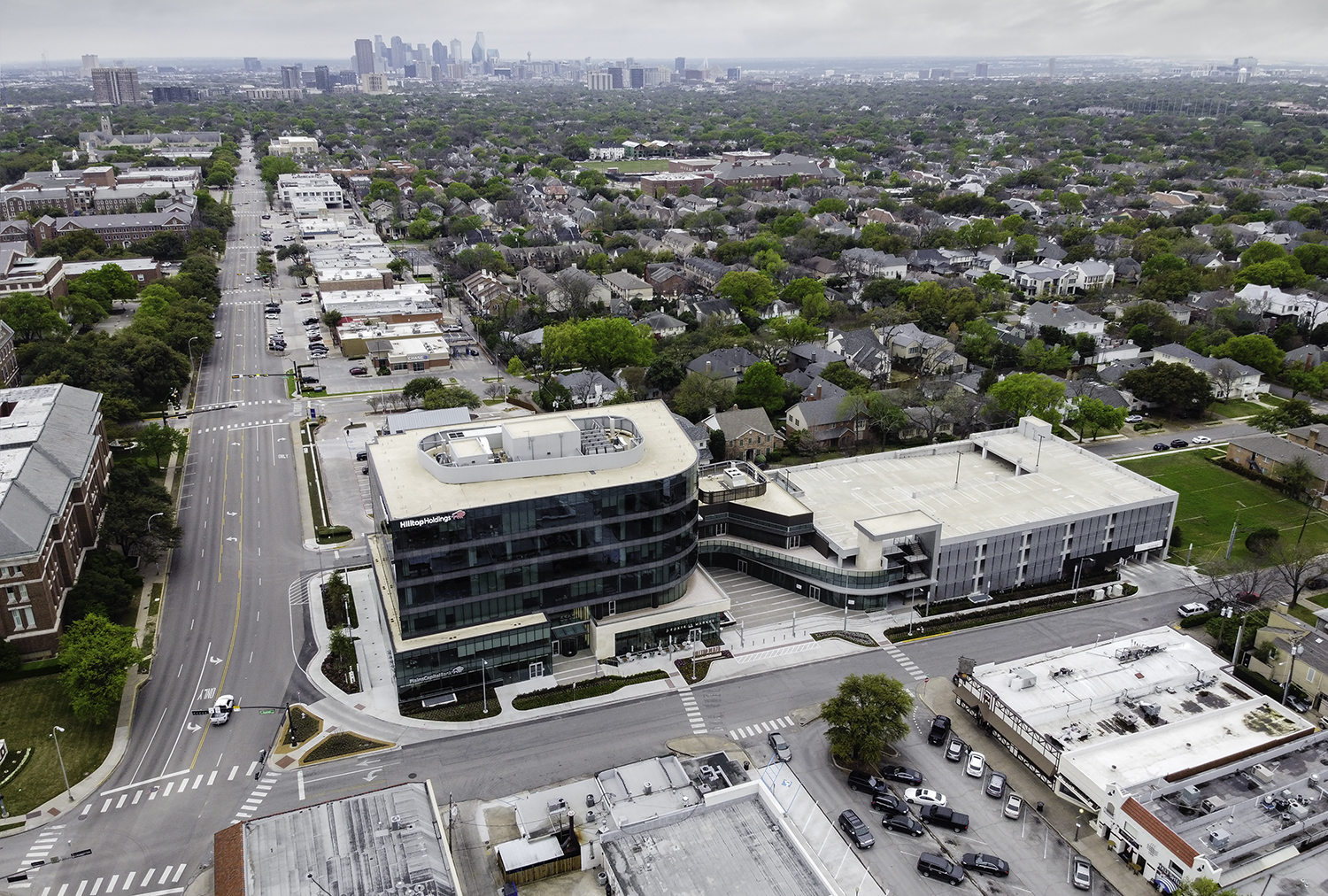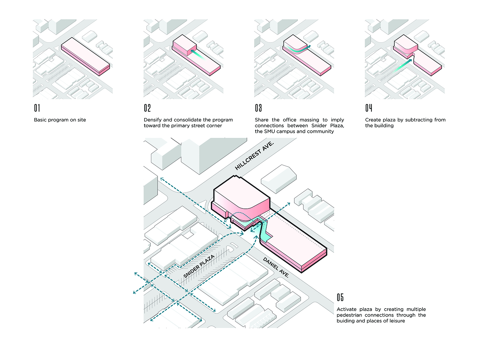 The design for Hilltop Plaza creates a lively mixed-use development on the site of an office building that had been vacant for years. The site, which is adjacent to Snider Plaza, is the terminus to the already prosperous outdoor retail environment. The building massing is explored in a way to pull any required program height near the main thoroughfare frontage while keeping the low-rise elements adjacent to the residential neighborhood. Special attention was given to privacy and sound transmission because of the residential neighbors. The street-level building articulation is designed to show a hierarchy of building entrance locations, identification of vertical circulation and inviting pedestrian connectivity as much as possible.