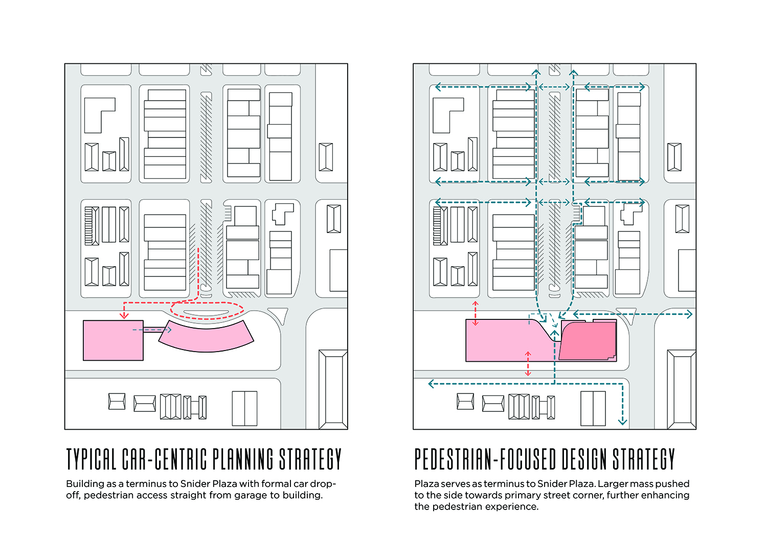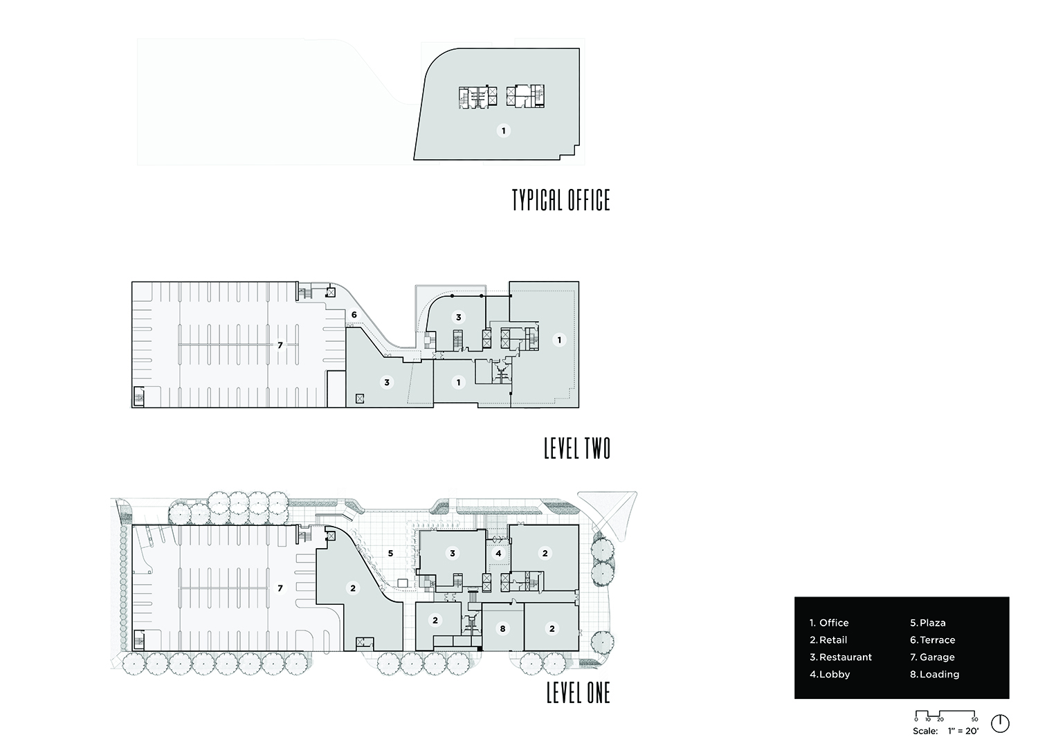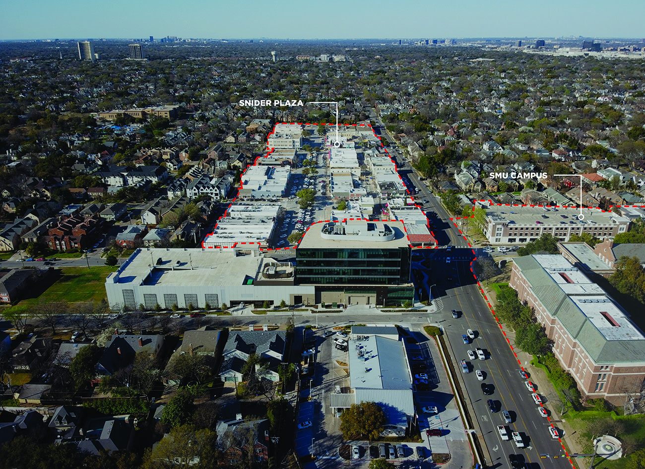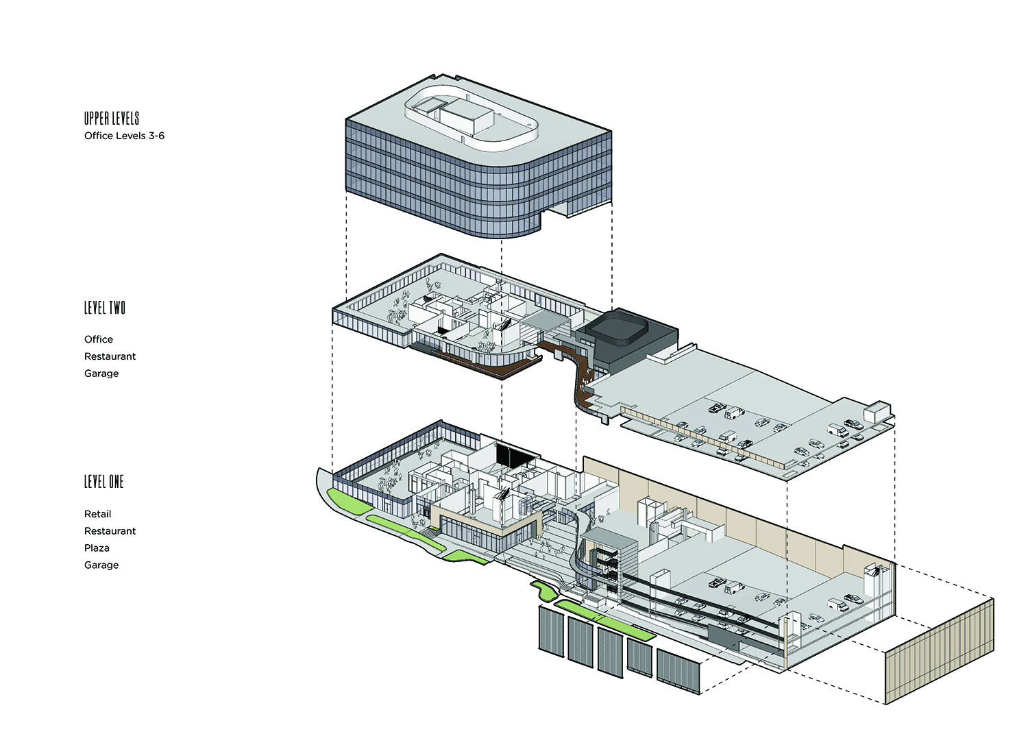 The program includes 27,000 SF of retail space, 14,000 SF of restaurant space with outdoor balcony seating, 80,000 SF of office space, below-grade parking for 640 cars and an outdoor pedestrian plaza. The ground-floor retail activates the street and provides connections to Snider Plaza.