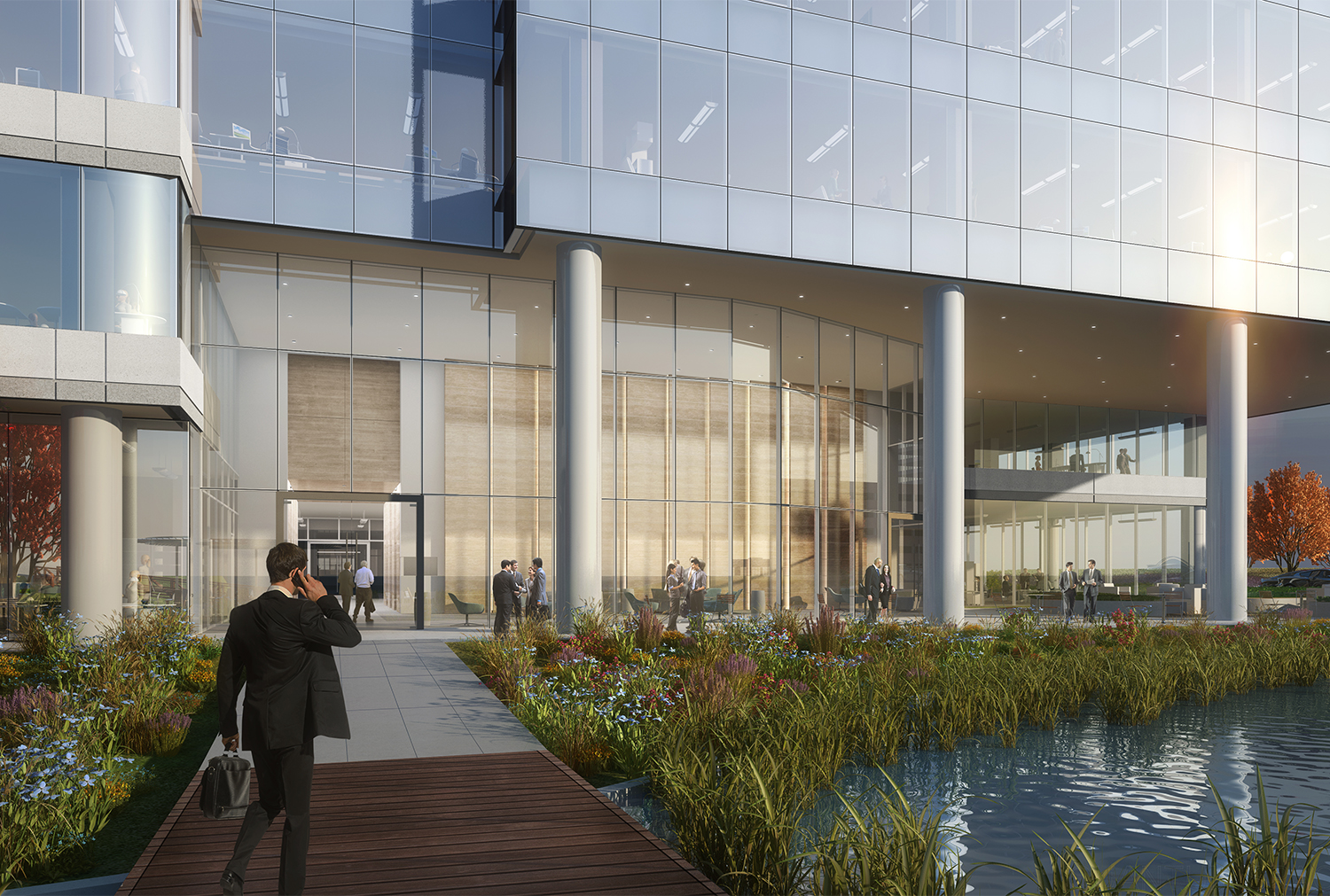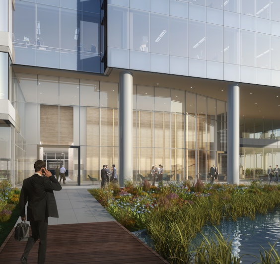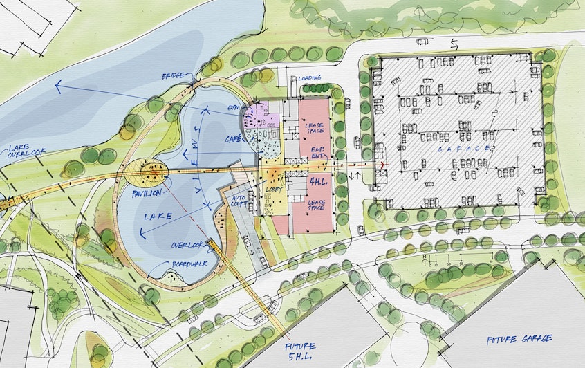 The building is designed to feel like you have entered a welcoming living room, tenants and visitors will never feel as though they have stepped into a cold and boring office building. Another outdoor living room is located on a deck overlooking the lake. Together, these amenities create a comfortable and relaxing environment for tenants and visitors alike. The ground floor will also include a fitness center.