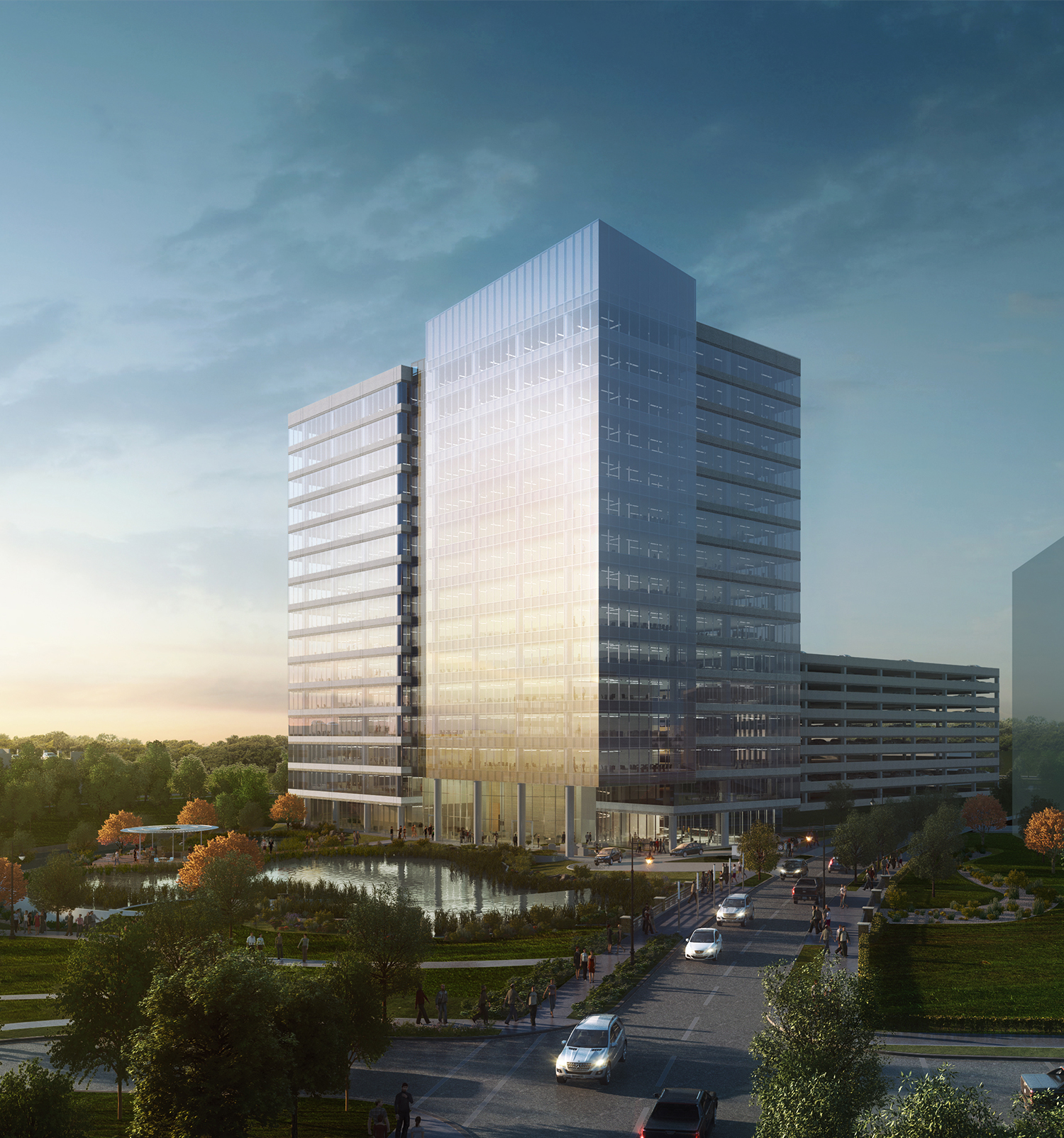 Located at the Howard Hughes campus in The Woodlands, this building sits in a row next to three existing office buildings. The 15-story tower is adjacent to a water feature that will be an amenity for the office tenants and provide scenic views for the tower. The building’s orientation is angled to take full advantage of the water feature and the neighboring lake. The client desired all the attributes that make a project great and iconic, and our team has done just that.