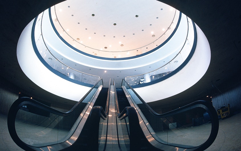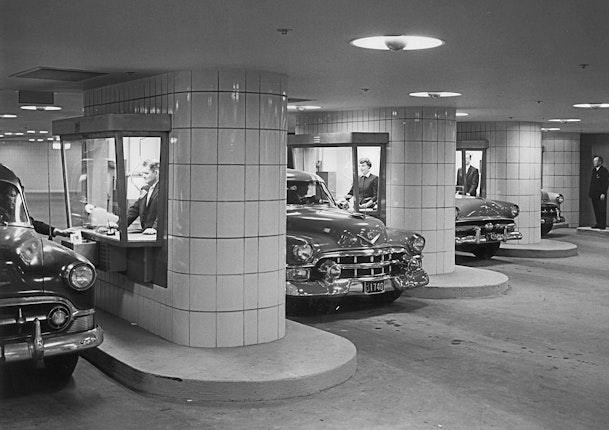 Also incorporated within the building were innovations such as underground drive-through banking and valet parking. The elevators inside the complex traveled at a rate of 1,400 feet a minute, making them among the fastest in the nation. The roof top "rocket" was lit with neon and was capped by a rotation beacon light. The banking lobby featured innovative techniques in engineering to create a column-free lobby where upper floors were hung from above. The lobby was finished with exquisite marble, inlaid wood and 3,000 square feet of pure gold leaf on the mezzanine rail.