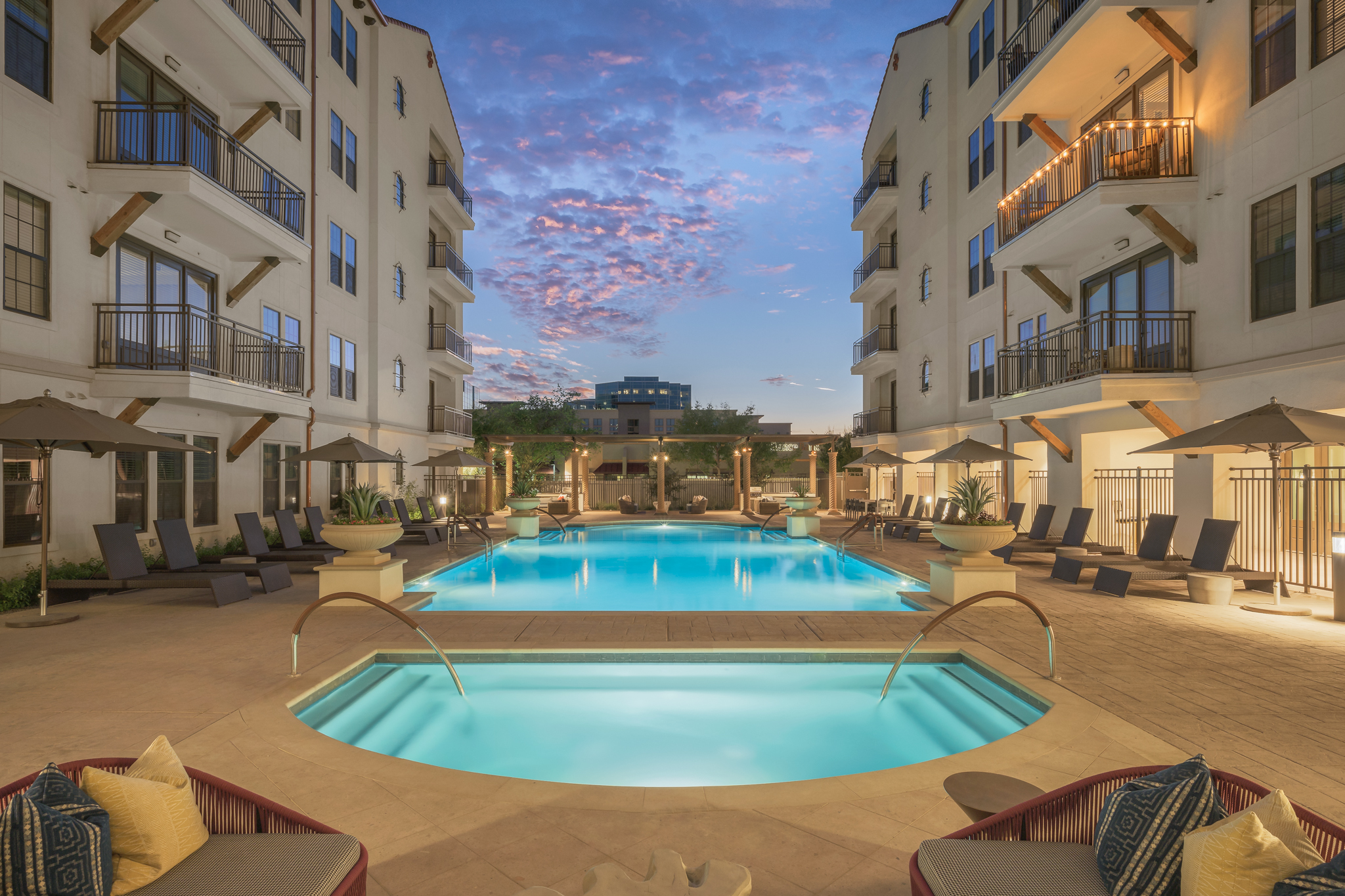 The Angela is a multifamily neighborhood located in the popular Biltmore District in central Phoenix. The building has striking architecture and distinctive interior design features including a boutique hotel-style lobby, a private bar and a great room for social gatherings. The site has easy access to nearby offices, shops and recreation. It includes 532 units with a mix of studio, one-bed, two-bed, and three-bed units.