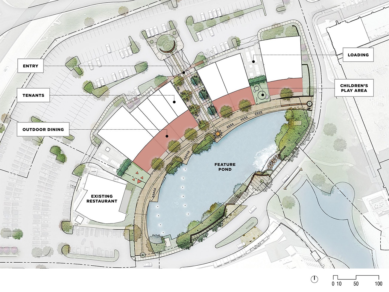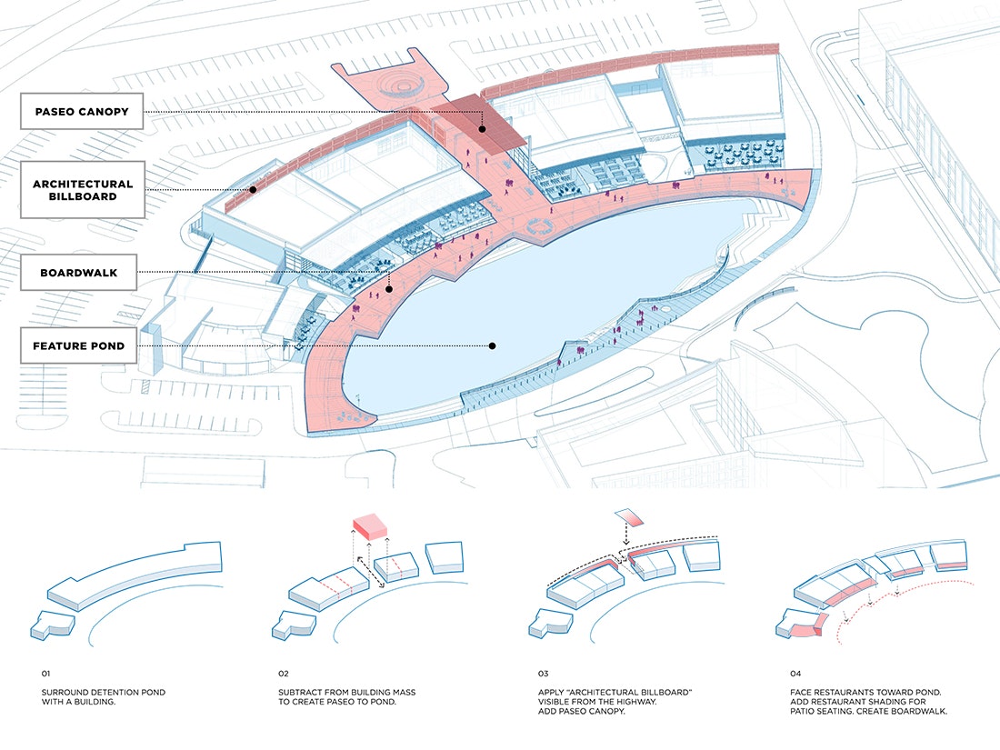 The site was originally set aside as temporary retail to be eventually replaced with a large commercial signature building. Instead of resorting to the usual road and parking lot facing site configuration, we turned the model inside-out. The existing retention pond was converted into an asset that would become the centerpiece of a true people place. The buildings were oriented to face the pond, consequently creating a more pleasant & hospitable outdoor environment for the restaurant patrons, with the buildings themselves acting as a buffer against the harshness of highway interchange and parking lot. The boardwalk has now become the heart of this office campus, as well as a destination for the local communities.