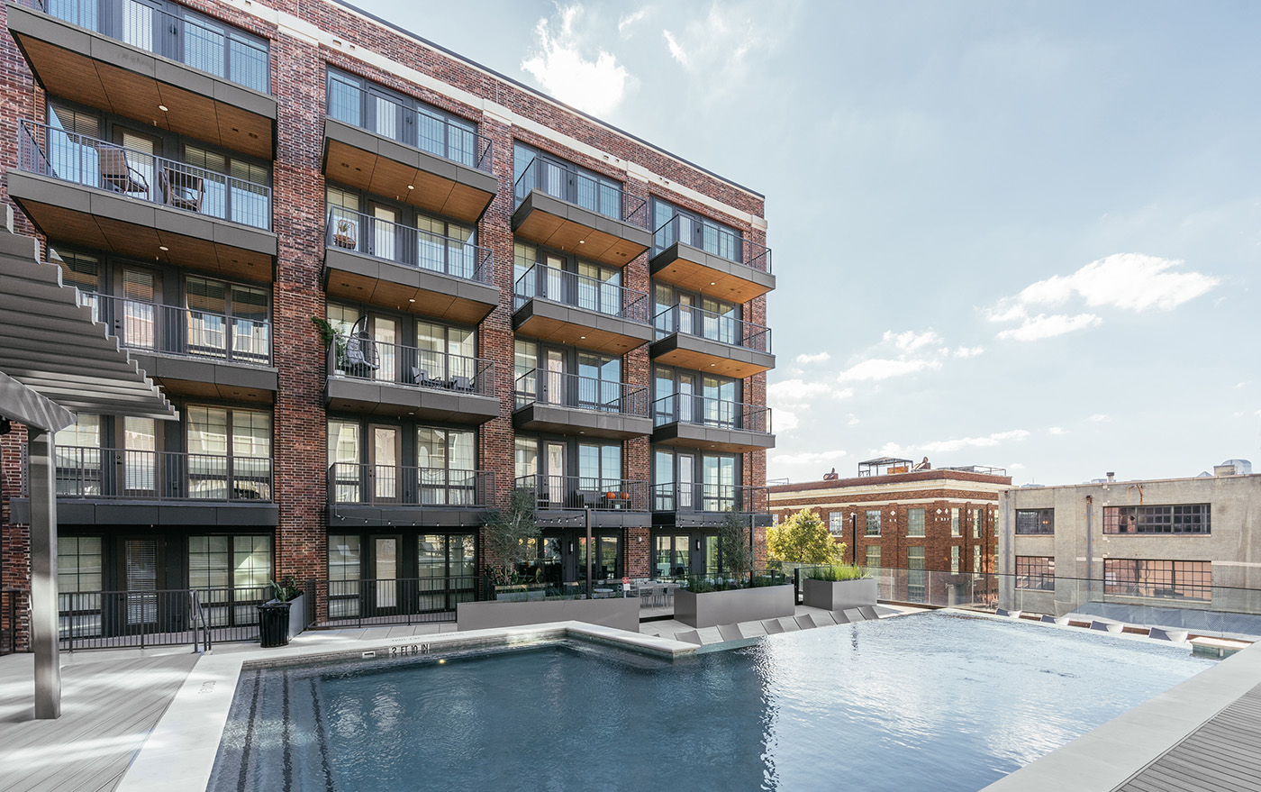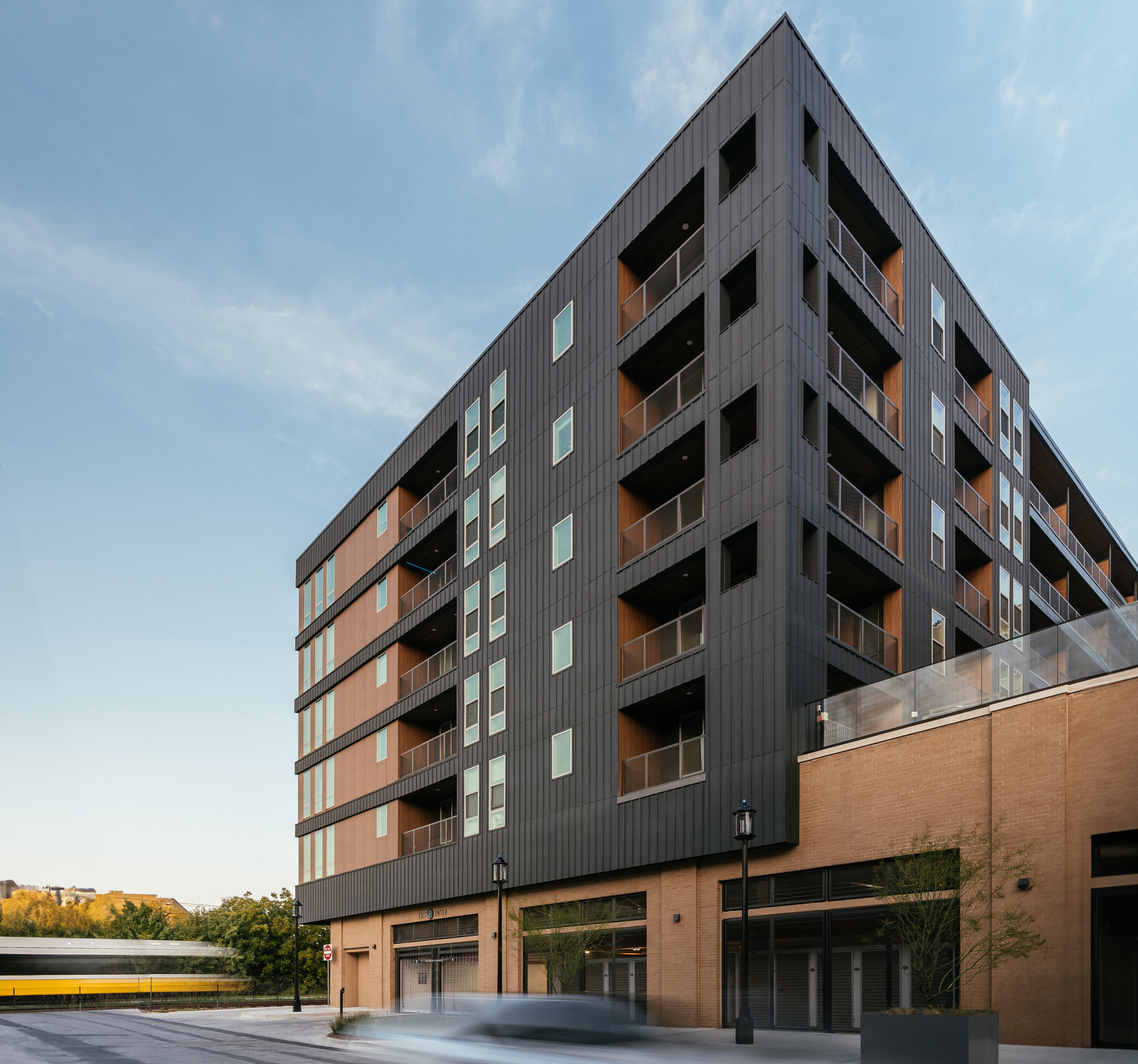 This 7-level podium project contains 190 units. The ground level has live-work units along with a large co-working and bar space at the amenity deck. The pool and amenity deck have grilling areas and gathering spaces. Tenants will enjoy the large fitness room as well as the large 6,000 SF park with dog areas and an open lawn.