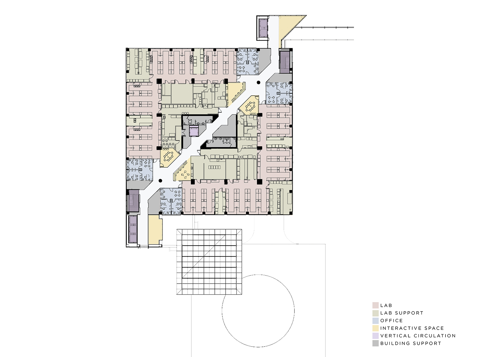 The layout of each lab floor, along with its vertical circulation, is organized to promote spontaneous collaboration between researchers—cultivating interactive spaces where interdisciplinary discoveries can emerge.
