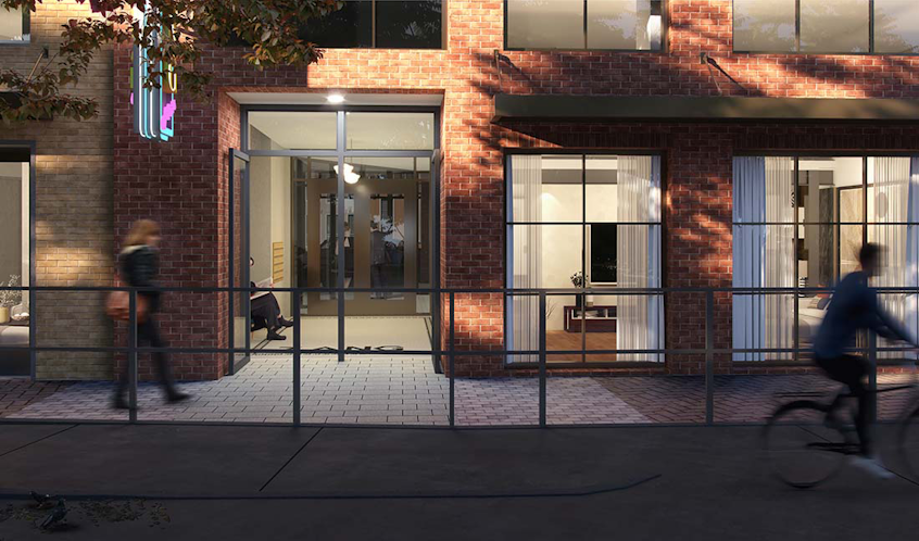 The building is located right off the lively intersection at Zang Boulevard with double volume height spaces that feature a work area below with mezzanine bedroom space above. We wanted to embrace the life that this neighborhood is known for and embrace the street by making it more engaging. The front doors are designed to mimic the surrounding areas that have storefronts that have been built up over time.