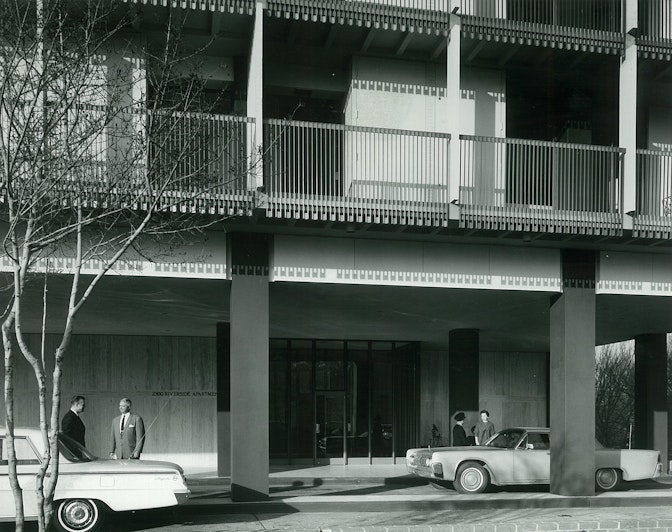 2300 Riverside is a luxury high-rise apartment building built on the banks of the Arkansas River in a fine, old, residential neighborhood, overlooking Downtown Tulsa. The 16-story building is simply and gracefully proportioned. Its expression is a careful composition of overlaying grids of building elements: structure, guard rails, glazed openings and solid masses.