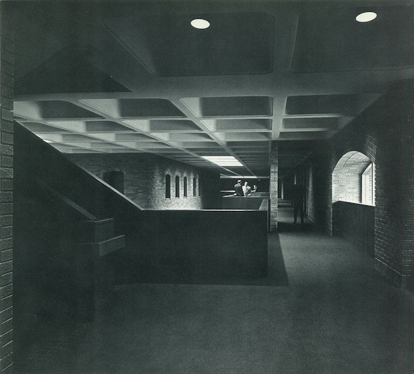 The waffle pattern of the exposed concrete ceilings offers visual excitement and, together with the door and window arches and the brick floor, provides an architectural unity throughout the building.