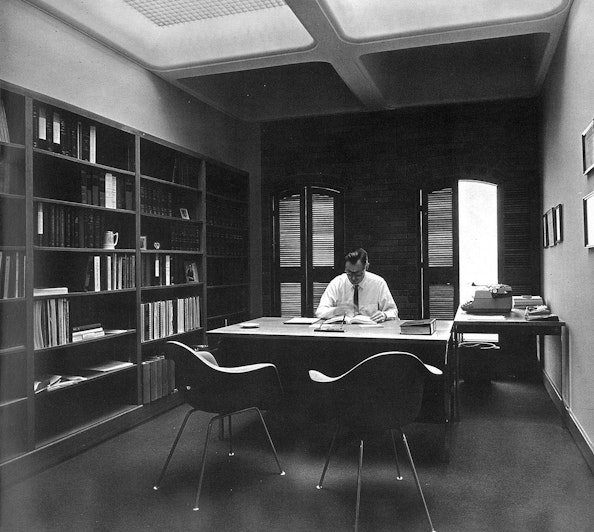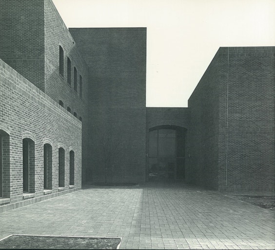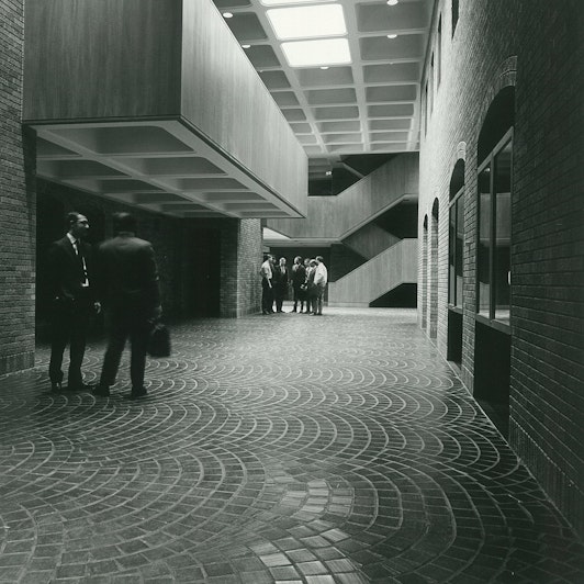 Early in the planning, it was agreed that this building should be compatible with other campus buildings which are an adaptation of the Spanish Renaissance style. This physical sympathy was achieved through utilizing the standard campus brick and the use of arched openings, deep set and scaled in relation to the variety of interior spaces.