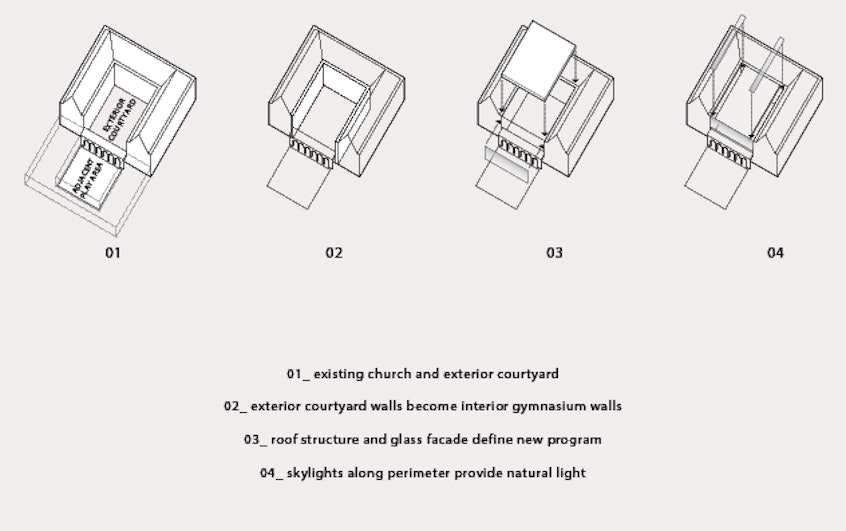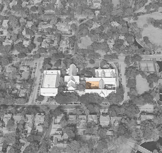 The site is located within an existing courtyard long forgotten and underutilized by its patrons. Highland Park Presbyterian Church needed a place for the student ministries to connect and the new gym provides that while honoring the historic architecture.