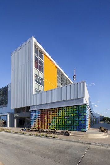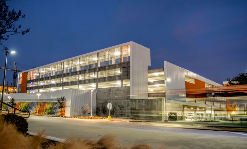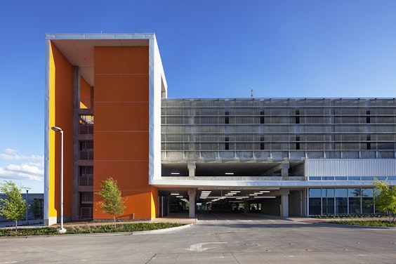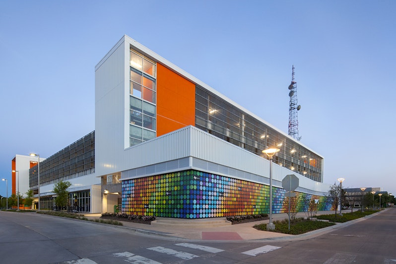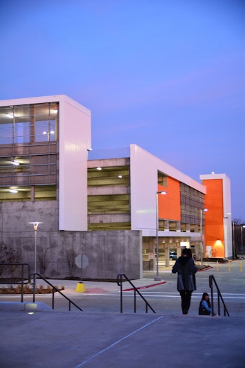 Sitting at the axis of vehicular travel and pedestrian movement, the Mixed-Use Parking Structure is central to the campus's core at UT Dallas.